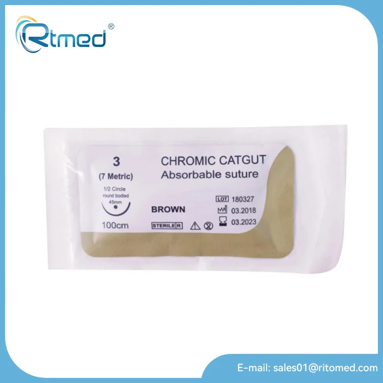 Denne RTMed Chromic Catgut er en type absorberbar kirurgisk sutur lavet af oprenset kollagen afledt af tarmen af får eller kvæg, som er blevet behandlet med kromiske salte for at bremse dens absorptionshastighed, hvilket giver den en længere trækstyrke sammenlignet med almindelig katgut; I det væsentlige er det en naturlig sutur, der gradvist opløses i kroppen over tid på grund af enzymatisk fordøjelse.